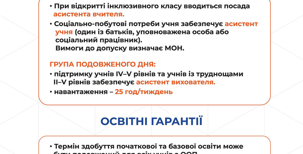 Одна з ключових змін — школа більше не має права відмовити у створенні інклюзивного класу, якщо батьки подали відповідну заяву та надали висновок інклюзивно-ресурсного центру. Інклюзивний клас може бути створений навіть для однієї дитини з ООП, яка потребує другого – п’ятого рівня підтримки.