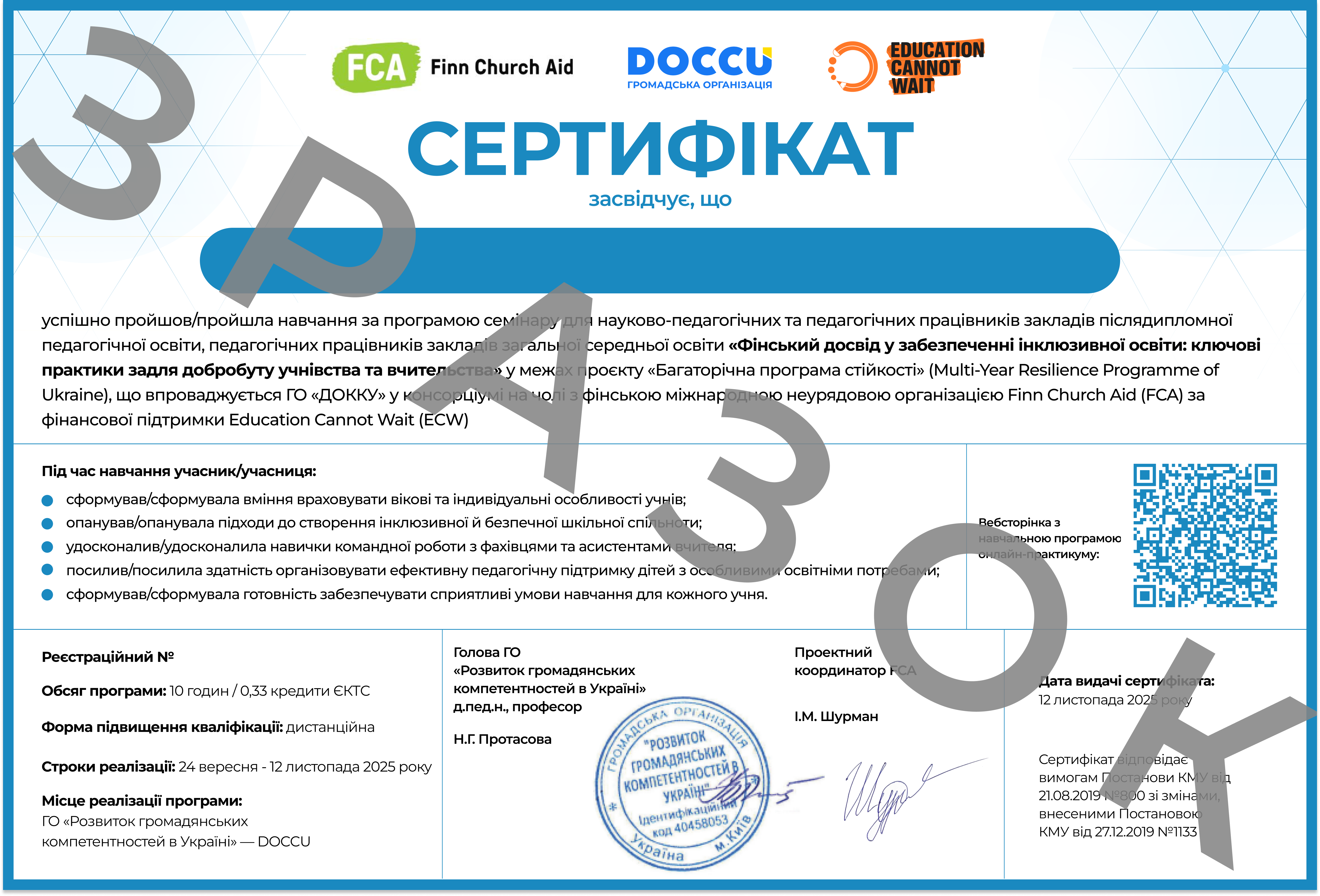 Програма підвищення кваліфікації проходить в межах проєкту «Багаторічна програма стійкості» реалізовує ГО DOCCU у консорціумі на чолі з міжнародною неурядовою організацією Finn Church Aid Ukraine.