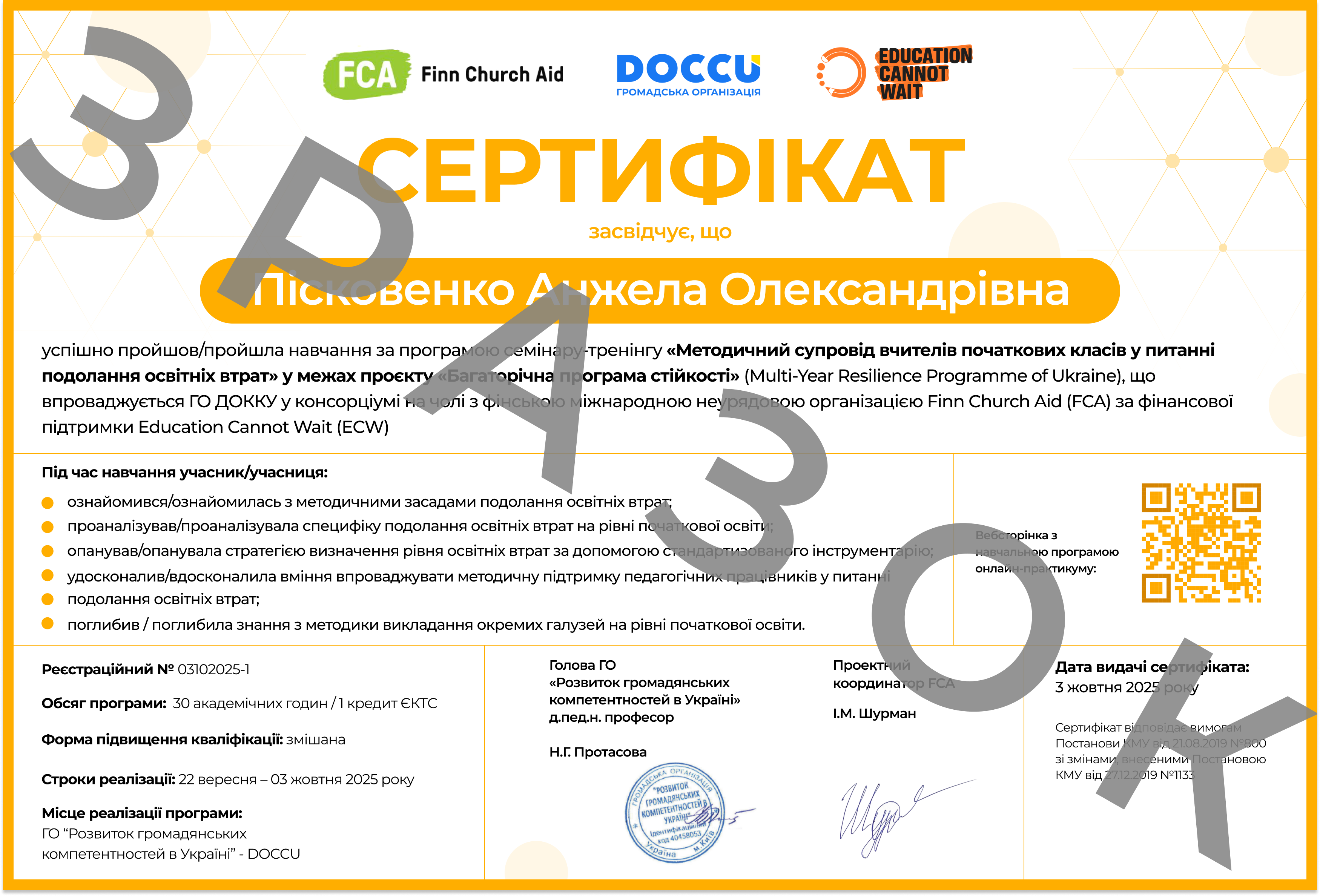 Програма підвищення кваліфікації проходить в межах проєкту «Багаторічна програма стійкості» (MYRP), що реалізовує ГО DOCCU за фінансової підтримки Education Cannot Wait у рамках співпраці з міжнародною неурядовою організацією FCA Finn Church Aid